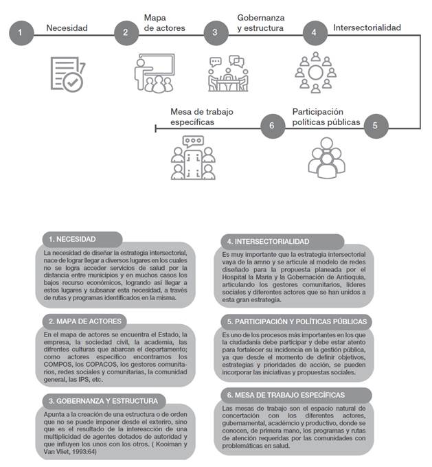 Por consiguiente, se convocaron líderes territoriales, gestores comunitarios, profesionales de la salud, organizaciones, instituciones, fundaciones, alcaldías, secretarías de salud, entre otros, donde se capacitaron por medio de los talleres que se realizaron y se desarrollaron capacidades de líderes con todos los participantes para lograr la definir la estrategia intersectorial mancomunadamente con los objetivos del proyecto. Así, se construye con ellos la forma de constituir la estrategia en los municipios priorizados y se estipula que se deben tener en los territorios las mesas de trabajo por subregiones e iniciar el piloto en algunos municipios del departamento de Antioquia y así mismo tener una estructura adecuada para cada mesa de trabajo elegidas democráticamente entre los actores aliados de las instituciones participantes.