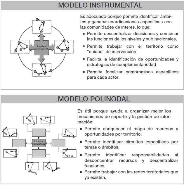 Dentro de los factores clave para la conformación de la estrategia intersectorial es pertinente pensar en su estructura; Villalobos (2016) enuncia algunos modelos con sus principales ventajas y desventajas y concluye que para la acción intersectorial se puede proponer alguno de estos dos: