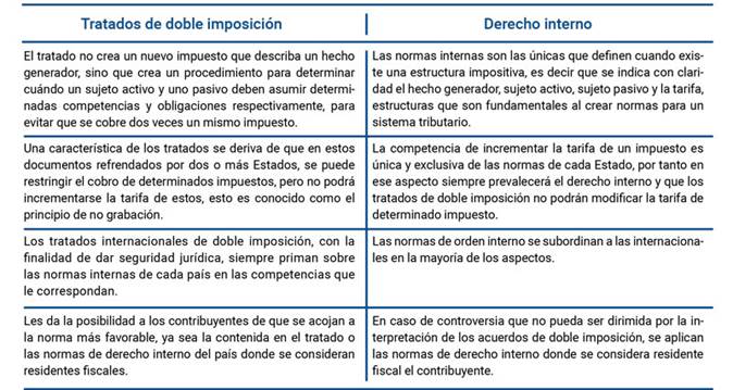 Entre las normas internas y los tratados de doble imposición, hay una serie de competencias aplicables a todos los Estados. Entre algunos convenios vigentes se tiene el convenio entre el Gobierno de la República de Colombia y el Gobierno de la República de Italia, convenio entre el Gobierno de la República de Colombia y el Gobierno de la República de Panamá para evitar la doble imposición. Lo descrito anteriormente se resume en la tabla 1.