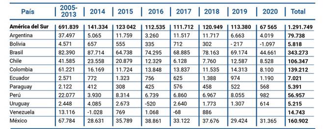 Fuente: elaboración propia a partir de entradas de inversión extranjera directa en América del Sur, (En millones de dólares). OCDE (2021).