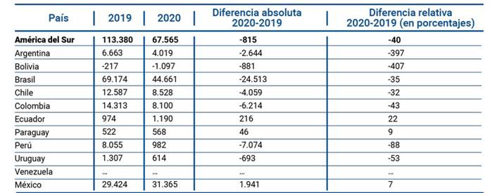 Fuente: elaboración propia a partir de diferencia relativa de la Inversión extranjera por el COVID en América del Sur - (En millones de dólares). OCDE (2021).