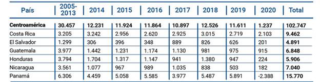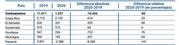 Sobre la situación vivida en los dos últimos años a causa del Covid-19 sobre el año 2019, en Centroamérica se obtuvo un total de $11.611 millones de dólares, y en el 2020 $1.23 millones de dólares, presentando una diferencia absoluta de $-10.434 y de diferencia relativa de -89.