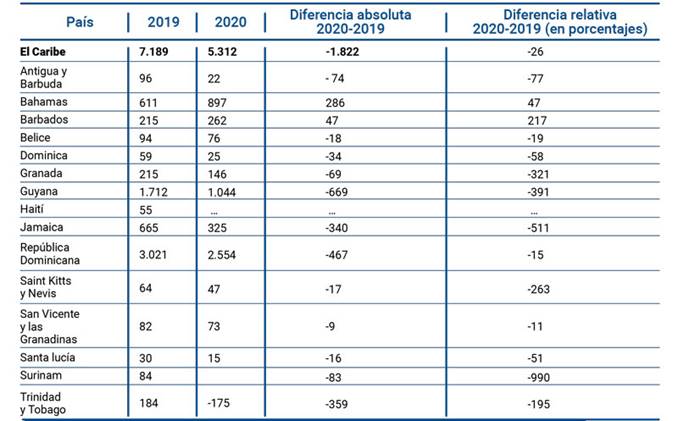 La afectación del Covid-19 en los países del Caribe del 2019 y 2020 fue significativa en resultados negativos de la inversión indirecta extranjera por un valor total de $-1.822 millones de dólares, de los cuales los países con mayor afectación con una diferencia absoluta son Guayana con $-669 millones de dólares; Jamaica con $340 millones de dólares; y Trinidad y Tobago con $359 millones de dólares.