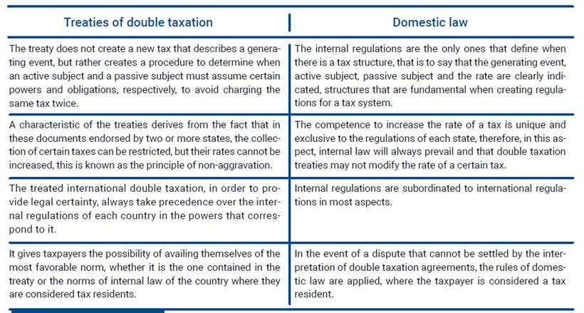 Treaties against Double Taxation are characterized by the obligation of the States to ensure the nature of their internal laws in their respective jurisdictions, this is done to avoid the problems derived from the classification of dualist and monist systems.