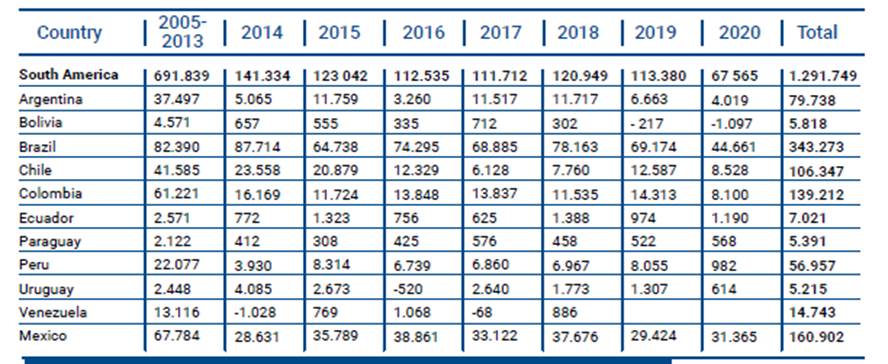 Source: Prepared by the authors based on foreign direct investment inflows in South America, (in millions of dollars). OECD (2021).
