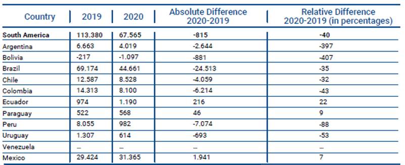 Source: own elaboration from Relative difference in foreign investment due to COVID in South America - OECD ( in millions of dollars) (2021).