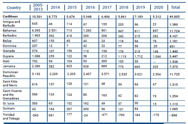 Source: own elaboration based on foreign investment inflows by Caribbean countries, - OECD (2021).