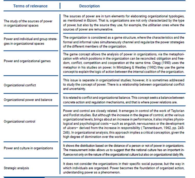 When the study of power in organizations is presented, many postulates are found (Figure 5), diversity in related subtopics and relevance within organizations.