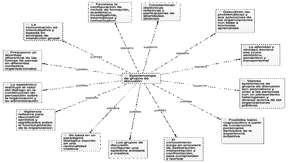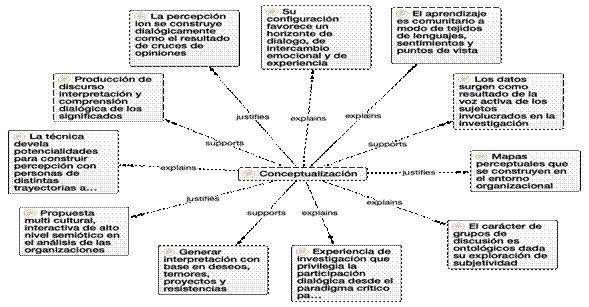 Desde el punto de vista epistemológico, la técnica genera nichos de investigación académica e informativa, que son pertinentes y útiles para construir una percepción organizacional sistémica y que respete los lenguajes y las identidades de sus funcionarios y directivos. Articula dialécticamente la reflexión y la participación de alteridades diferentes, lo que permite descubrir problemáticas y soluciones, a partir de las lecciones aprendidas acerca de lo que es y cómo funciona la organización. La alteridad deviene del cruce semiótico, semántico y transpersonal, con el fin de construir valores asociativos que unen el pensamiento diverso de los participantes. La deliberación y la interpretación hace surgir el conocimiento sobre la percepción organizacional, en entramados cognoscitivos que configuran una episteme solidaria y creativa en el marco de una racionalidad abierta, critica e incluyente.