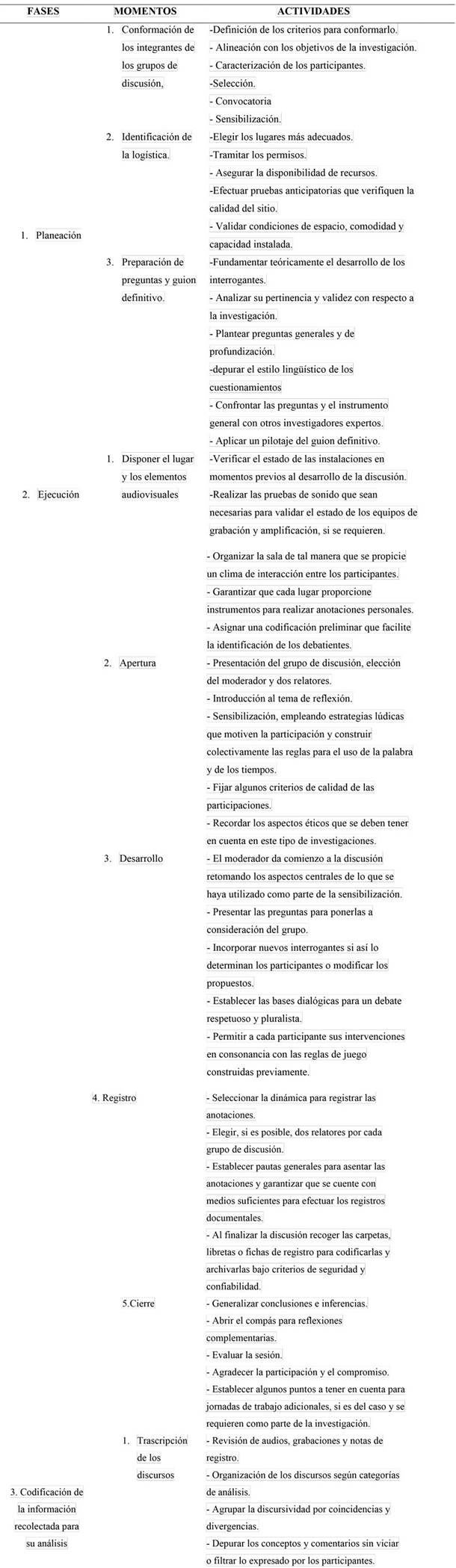 La mecánica para la implementación del grupo de discusión, después de hacer el registro, identificar a los participantes, firmar el consentimiento informado y cumplir con otros aspectos que el investigador determine pertinentes, es dar vía libre a la discusión con la mediación de cuatro momentos: apertura, desarrollo, registro y cierre. El abordaje de estas etapas es sistémico, cada una va encadenada con la otra y es preciso que el moderador, que por lo generar es el mismo investigador o algún integrante del grupo de trabajo, asegure que la motivación sea sostenida, de tal modo que fluya el discurso, la creatividad y la opinión sin ningún tipo de presiones ni barreras (Eisenberg y Goodall, 2013).