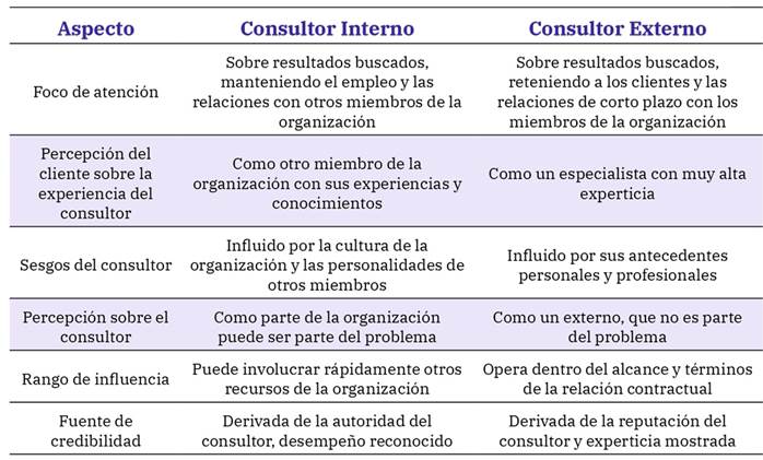 Las diferencias más específicas entre consultor interno y externo han sido planteadas en un documento que hace un análisis comparativo (tabla 1).