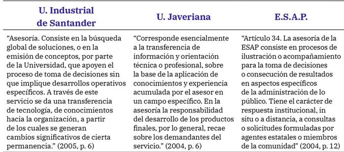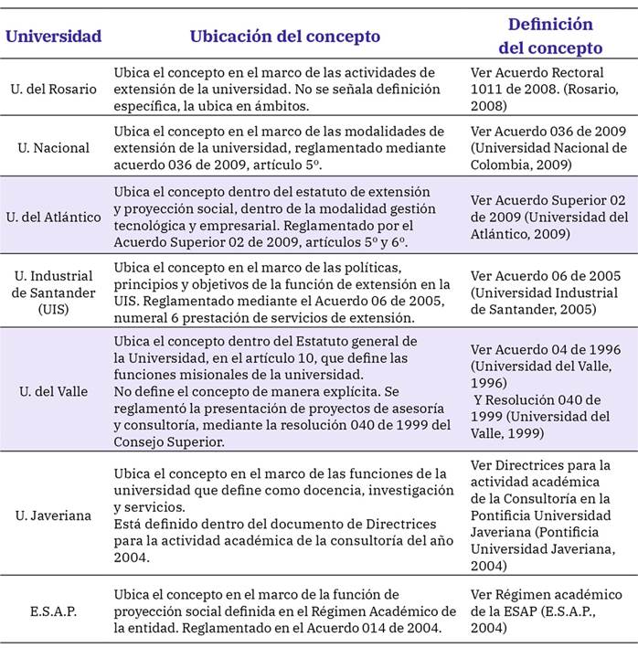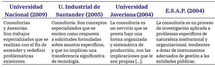 Tabla 2: Contexto y definición del concepto de Consultoría y Asesoría en Universidades colombianas