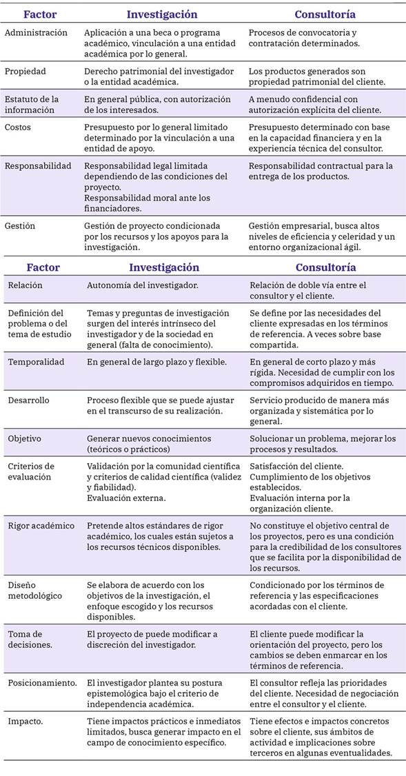 Tabla 5: Factores de diferenciación Investigación – Consultoría