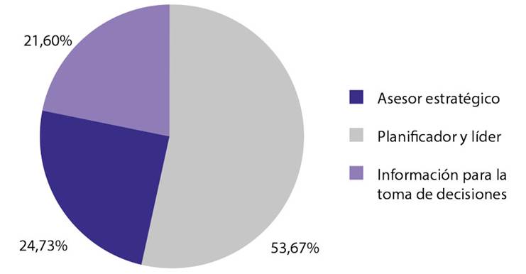 Los resultados muestran que, para los empresarios, el rol del contador en sus empresas se fundamenta en tres pilares como se puede observar en la figura 1. El 53,67% de los empresarios esperan que el contador sea un asesor estratégico en la gestión contable y fiscal, minimizando riesgos y evitando sanciones a través de la identificación y comunicación de posibles fallas que requieren corrección. En el 24,73% de los casos, los empresarios valoran al contador como planificador y líder, con habilidades de análisis y establecimiento de controles para optimizar recursos y maximizar la rentabilidad. Finalmente, un 21,60% considera que la información financiera proporcionada por el contador es determinante para tomar decisiones estratégicas que mejoren el direccionamiento de la organización.
