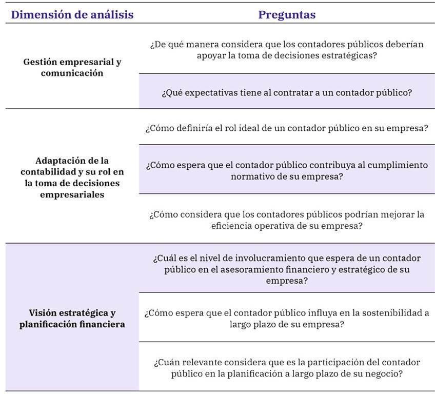 El marco teórico permitió identificar tres dimensiones de análisis; i) gestión empresarial y comunicación, ii) adaptación de la contabilidad y su rol en la toma de decisiones empresariales, y iii) visión estratégica y planificación financiera. Estas dimensiones sirvieron de base para definir las preguntas de la entrevista semiestructurada, tal como se muestra en la tabla 1.