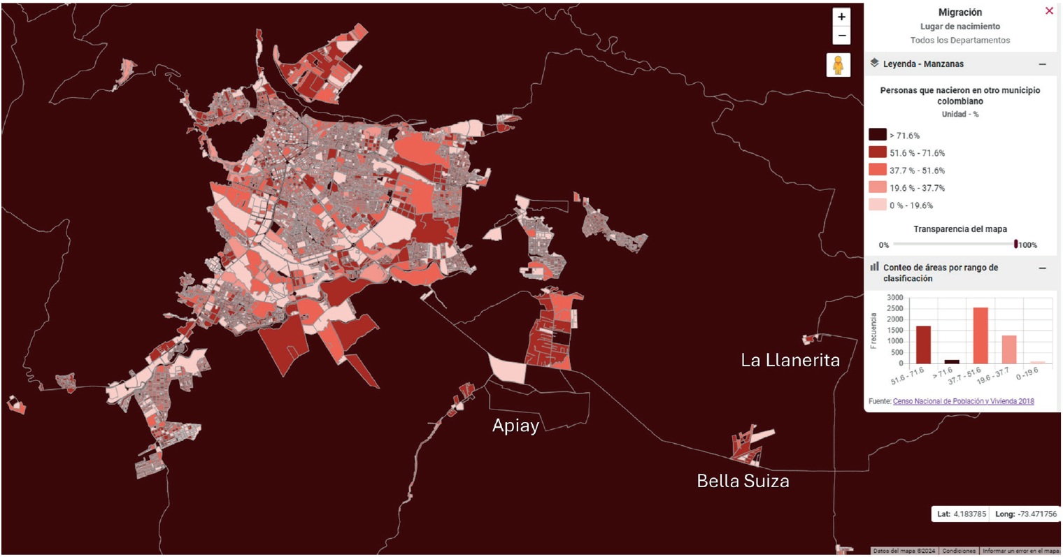 El crecimiento poblacional de Villavicencio ha sido amplio en las últimas décadas, pasando de 173 745 habitantes en 1985 a 585 858 en 2024, aproximadamente (DANE, 2023), es decir, más del 200 % en casi 40 años. Ahora bien, la figura 2 evidencia un alto poblamiento por migración (DANE, 2019) que, a diferencia de otras ciudades intermedias, pudo haber estado marcada por expectativas en torno a cambios económicos que ofrecía la nueva ciudad petrolera, pero también por la seguridad que representaba esta en materia de orden público, pues a ella llegaban desplazados de otras regiones esperando encontrar tranquilidad y oportunidades de empleo.