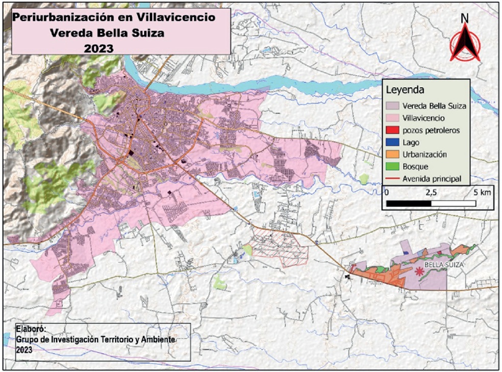 El estudio contempla las veredas Apiay, la Llanerita y Bella Suiza (ver figura 1), que pertenecen al corregimiento siete de la zona tres de Villavicencio. Territorialmente estas juegan un papel muy importante, porque se encuentran en una zona con dinámicas de expansión urbana, generando presión por el uso de los recursos naturales (RRNN), en este caso sectores boscosos y afectación a las fuentes de agua en sus sectores aledaños, que alimentan la cuenca del río Ocoa. En este sentido, estas veredas experimentan, de primera mano, el fenómeno de la periurbanización, es decir, la expansión urbana que poco a poco transforma las zonas rurales y que, en este caso, es causada por los intereses de la actividad petrolera.