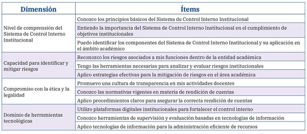 El instrumento se diseñó considerando cuatro dimensiones que responden al objetivo general: 1) comprensión del Sistema de Control Interno Institucional, 2) capacidad para identificar y mitigar riesgos, 3) compromiso con la ética y la legalidad, y 4) dominio de herramientas tecnológicas. Cada dimensión se integró con indicadores e ítems que permitieron valorar desde la percepción del encuestado el nivel de conocimientos, habilidades y actitudes del personal docente en relación con el control interno institucional.