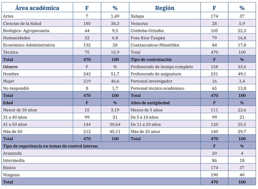 Respecto a la procedencia del personal académico, la mayor parte pertenece a la región Xalapa (37 % de la muestra), seguida por las regiones de Córdoba-Orizaba (22,3 %), Coatzacoalcos-Minatitlán (17,8 %) y Poza Rica-Tuxpán (16,8 %); la región de Veracruz tuvo la menor participación con el 5,9 %.