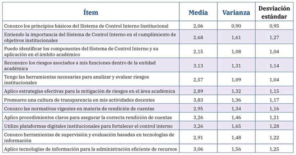 De acuerdo con los resultados de la tabla 4, se pueden identificar patrones respecto al conocimiento y prácticas del profesorado en materia de control interno institucional, con base en las respuestas, considerando la media, la varianza y la desviación estándar de cada ítem.