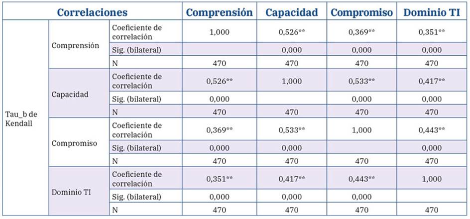 Para conocer la relación entre las dimensiones de comprensión del Sistema de Control Interno, capacidad para identificar y mitigar riesgos, compromiso con la ética y la legalidad, y dominio de herramientas tecnológicas, que conformaron el instrumento aplicado, se agruparon los ítems en variables y posteriormente se utilizó el coeficiente de correlación tau-b de Kendall, para datos ordinales y muestras no paramétricas.