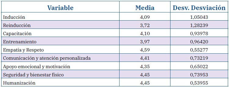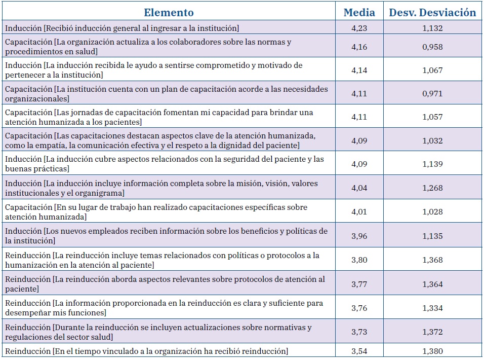 Se puede evidenciar una percepción mayoritariamente positiva por parte del personal de salud en relación con los procesos formativos y la humanización de la atención en el servicio de urgencias, observando las dimensiones de inducción y capacitación con medias elevadas, lo que indica que ambos procesos son considerados útiles, pertinentes y coherentes con las necesidades del entorno hospitalario. No obstante, la reinducción al registrar la media más baja (3,72) y la mayor dispersión (1,28) sugieren inconsistencias en su aplicación o una menor frecuencia, posicionándola como un aspecto susceptible de mejora institucional (ver tabla 4).