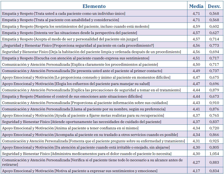Así mismo, los factores de comunicación (4,49) y atención personalizada (4,50) ponen de manifiesto que una clínica orientada a la práctica, centrada en la calidad del cuidado incide, de forma favorable, en la experiencia y satisfacción del paciente (ver tabla 3). Finalmente, en lo que atañe a la ayuda a nivel emocional y motivacional se menciona que la ayuda ofrecida por el personal de salud favorece no únicamente el bienestar mental del paciente, sino que además potencia su conocimiento de la enfermedad y el proceso del cuidado médico. En conjunto, estos resultados permiten concluir que el servicio de urgencias no solo cumple con los aspectos técnicos del cuidado, sino que también incorpora con eficacia los principios de la atención humanizada, consolidándose como un entorno favorable para la recuperación integral del paciente.