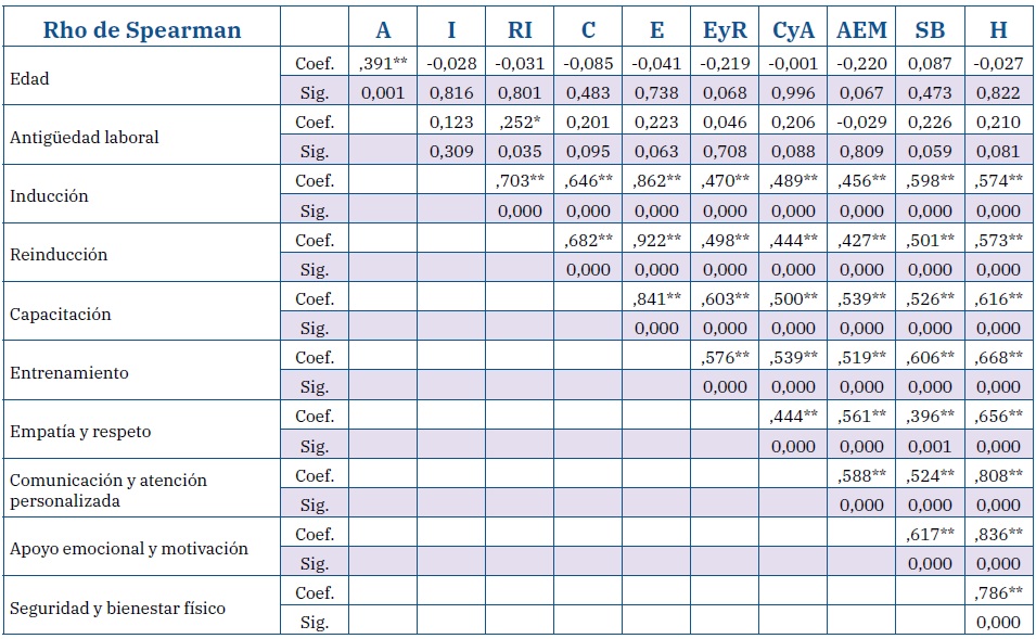 Se plantearon escenarios de relación, encontrados en las variables categóricas: a mayor edad existe una mayor permanencia en el área de urgencias, quienes cuentan con más años de experiencia tienden a valorar los procesos de reinducción; por otro lado, las variables de estudio se correlacionan entre sí. En ese sentido, la hipótesis planteada sobre la relación entre el entrenamiento y la humanización se confirma, ya que todas las variables analizadas están interrelacionadas, señalando la dependencia entre las mismas (ver tabla 6), lo que refiere la necesidad de seguir formando a las personas, es decir, una estrategia formativa integral favorece la humanización del cuidado, especialmente en contextos de alta exigencia como los servicios de urgencias.