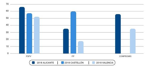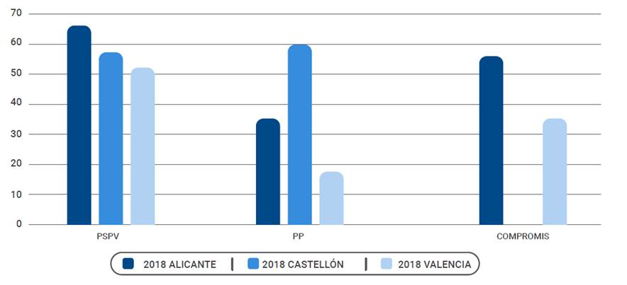 If we take into account the percentage of municipalities governed, as of 2015, by one of the three majority political parties in the community (PSPV, Partido Popular and Compromis) in relation to the number of municipalities analyzed that govern each of the provinces, we see in Graph 2 that in 2018 the two leftist parties (PSPV and Compromis) have greater representation in the province of Alicante and that instead the Popular Party has greater weight in the province of Castellón, which is the smallest of the three provinces .
