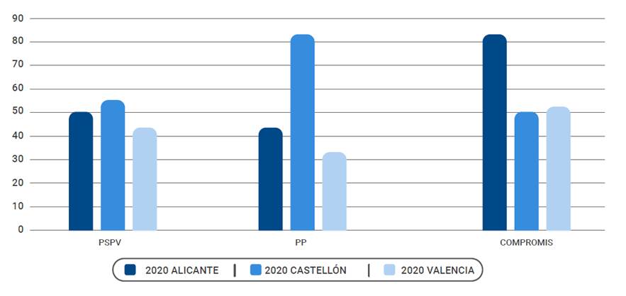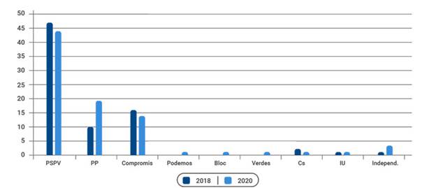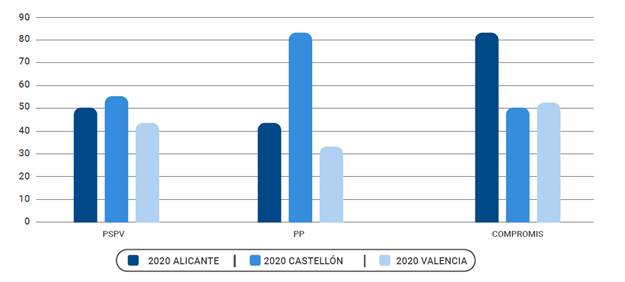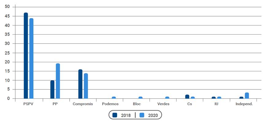 The situation changes after the 2020 elections, recovering in Alicante and Valencia the power that the Popular Party had had for the last twenty years, the PSPV descends in the three provinces and Compromis increases it in all three. Despite these changes, there is not a great variation in the number of PP experiences.