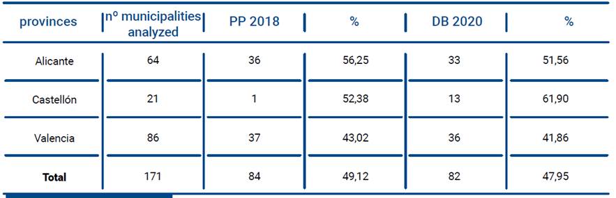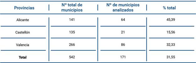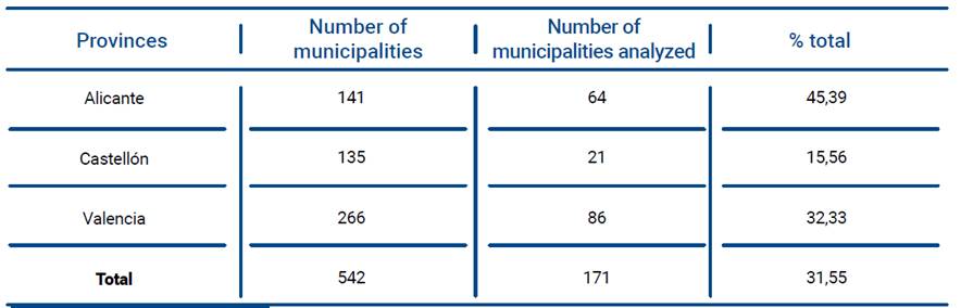 Table 1 offers data corresponding to the total number of municipalities by province of the Valencian Community, the total number of municipalities investigated, which amounts to 171, and the percentage of municipalities analyzed.