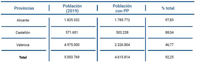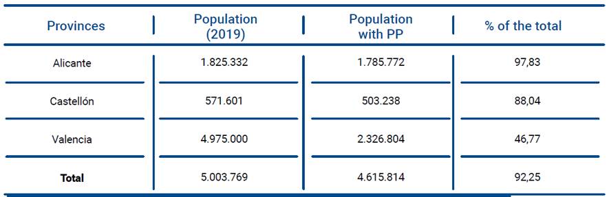 In Table 2 we can see the total population and by provinces of the Valencian Community, the population with PP and the percentage of the population with PP of the total population.