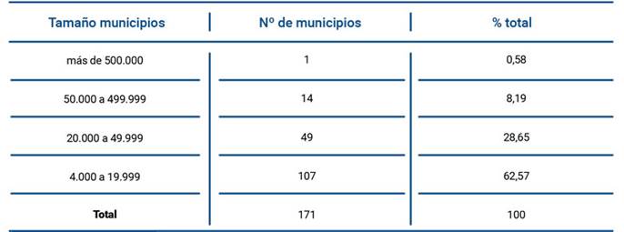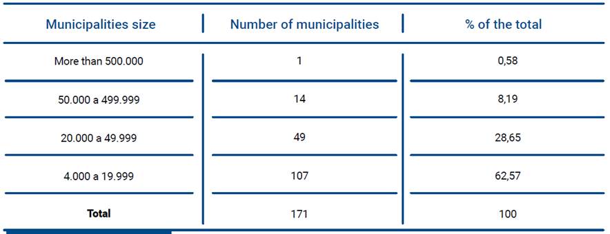 Regarding the size of the municipalities, the majority (62.57%) are municipalities that range between 4,000 and 19,999 inhabitants, that is, of medium-low size.