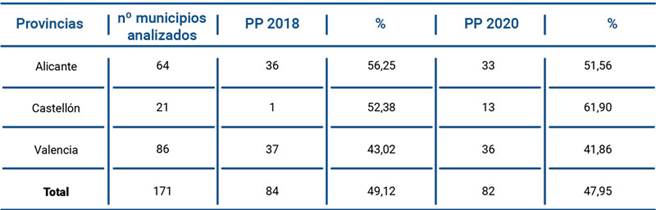 Looking at the population data although 31.55% of the municipalities have PP, they account for 92.25% of the total population of the community. Valencia being the one with the lowest percentage and Alicante, with larger municipalities, the one with the highest percentage.