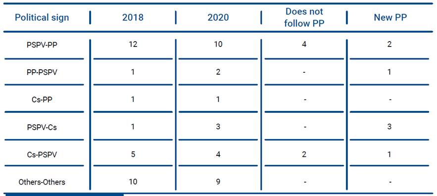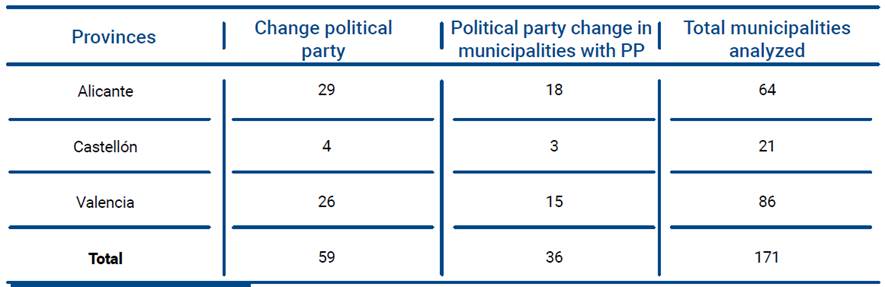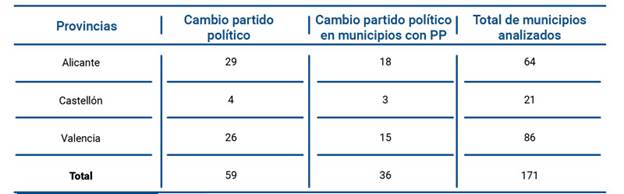 En los sufragios de orden municipal de mayo de 2019, 59 municipios de la Comunidad Valenciana cambiaron el signo político de sus alcaldes, lo que supone el 34,5% de los municipios analizados, siendo la provincia de Alicante donde se han producido más cambios (45,31%) y la de Castellón donde menos (19%). En cambio, en aquellos municipios en que existe una experiencia de PP se han producido menos cambios, solo el 21% del total de municipios analizados han cambiado su signo político. Habría que analizar en profundidad si el PP ha sido un factor de continuidad para el partido político gobernante o si las razones han sido otras.