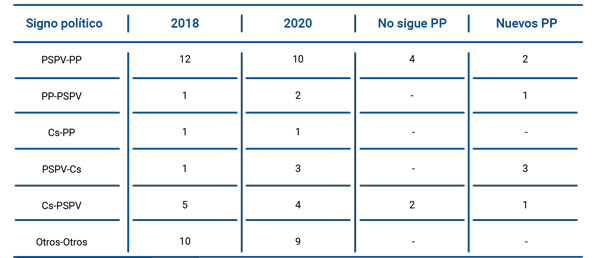 En la Tabla 5 se pueden apreciar los cambios producidos en los diferentes municipios analizados después de las elecciones del 2019, tanto en los municipios que tenían PP como los que no lo tenían.