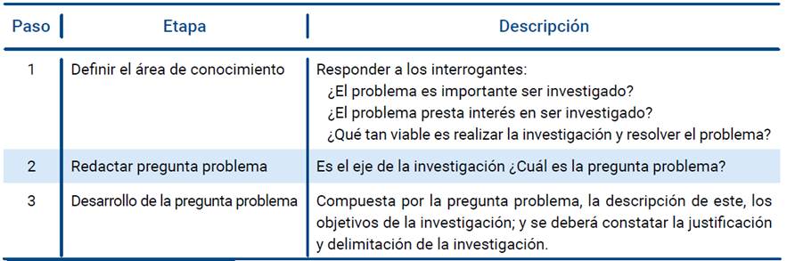 El segundo paso, consiste en redactar la pregunta problema y posteriormente un tercer paso que consiste en el desarrollo del problema que es la suma de estudios, en el cual se debe describir de manera clara el fenómeno que se procede a estudiar. En este aspecto, el académico deberá exponer “el porqué del estudio, cuáles son las causas del fenómeno y qué consecuencias habría si el problema no se solucionara” (Fuentes-Doria et al., 2022, p. 28). Es importante resaltar que, en el desarrollo del problema de la investigación elegida, para que sea completo debe estar compuesto por la pregunta problema, la descripción de este, los objetivos de la investigación; y se deberá constatar la justificación y delimitación de la investigación.