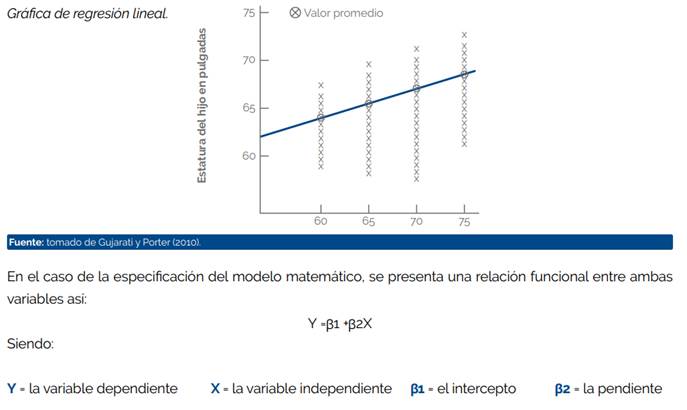 Según Gujarati y Porter (2010) en su libro sobre econometría, un análisis de esta regresión trata del estudio de dependencia que tiene una variable sobre otras variables (explicativas) para predecir un valor promedio poblacional en términos de los valores conocidos (p. 15). Presentando un contexto más amplio respecto al concepto, fue Francis Galton quien expuso por primera vez el término de regresión. En su trabajo Regression towards mediocrity in hereditary stature, Galton se centró en la descripción de la variable dependiente correspondiente a los rasgos físicos por medio de la variable independiente de los rasgos de los padres (Palacios-Cruz et al., 2013, p. 657).