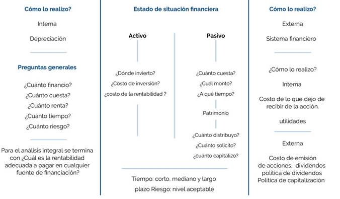 A fin de desarrollar el tema, se realiza la presentación conceptual de tres figuras2 relacionadas con los factores y la toma de decisión basados en la metodología de la revisión de literatura con el fin de ubicar al lector. La primera figura se enfoca en las decisiones de la tres grandes cuentas del Estado de situación financiera3 (balance), el activo, pasivo y patrimonio y su relación con la financiación. La segunda figura, hace referencia a la relación de la financiación de la empresa con el entorno. La tercera, profundiza en las decisiones de operación, inversión y financiación y la orientación en la inversión de los recursos. La interacción de las figuras permite que el lector conozca las variables que inciden en los procesos e identifique el área de mayor impacto dentro de su organización.