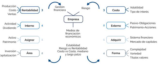 En este apartado el análisis se realiza desde dos escenarios: el primero hace referencia a la relación del entorno hacia la organización (financiación externa-uso interno), y el segundo de la organización hacia la misma empresa (financiación interna-uso interno) (Gill, 2000). Como se observa en la figura, la empresa debe propender por optimizar las decisiones con los medios de financiación económicos que maximizan la rentabilidad de la organización, siempre buscando la estabilidad con respecto al riesgo que se adquiere con el sistema de financiación y con la rentabilidad esperada de la inversión realizada (Fuentes, 2021). Además, es de tener en cuenta, que se debe analizar con la variable tiempo (ya sea a corto, mediano y largo plazo) para la disminución de los riesgos y la maximización de la utilidad (Meneses, 2014).