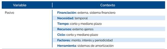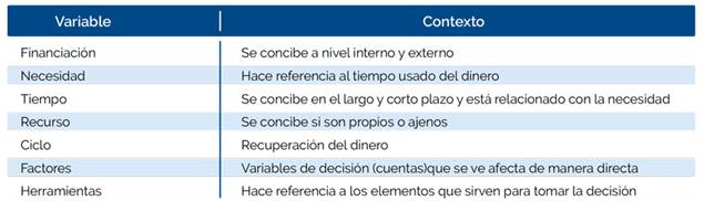 Para conocer el proceso, se presenta la tabla 1 con las variables a desarrollar, con el fin de contextualizar las cuentas principales del estado de situación financiera que son el activo, el pasivo y el patrimonio, y entrar a explicar la relación de estas en las decisiones. El análisis se realiza desde las variables de financiación, necesidad, tiempo, recurso, ciclo, factores y herramientas, las cuales se esbozan a continuación para que el lector este familiarizado con el contexto desarrollado.