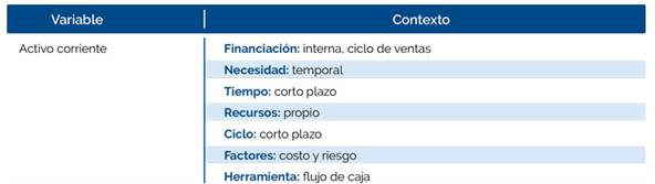Para la explicación en la subcuenta del activo corriente se presenta la tabla 3 con las variables contextualizadas y a continuación se realiza la explicación de cada una de ellas.