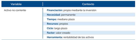 En el activo no corriente la financiación se orienta hacia las inversiones en los sistemas de producción, a su vez, mediante los sistemas de depreciación existe la posibilidad de autofinanciarse con el fin de mejorar la tecnología total de la organización. Con respeto al factor que debe tener en cuenta, es la creación de valor de la inversión en las maquinas como en los bienes inmuebles (Anaya y Niño, 2018).