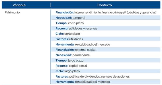 Para la explicación en la cuenta del patrimonio se presenta la tabla 5 con las variables contextualizadas y a continuación se realiza la explicación de cada una de ellas.
