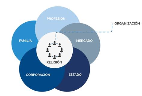 De acuerdo con Friedland y Alford (1991), las entidades centrales occidentales, como lo son el mercado capitalista, la democracia, el Estado burocrático, la familia y la religión cristiana, son parte de los órdenes institucionales que conforman el diverso entramado de instituciones que caracteriza a las sociedades complejas o modernas (figura 1).