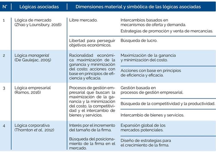 Al integrar las dimensiones materiales y simbólicas de cada una de las lógicas institucionales previamente analizadas (mercado, managerial, empresarial y corporativa), nos encontramos con un concepto integrador de lógica económica que puede ser operacionalizado a través de indicadores que estén asociados a las dimensiones materiales y simbólicas de cada una de las lógicas institucionales que lo conforman (tabla 1)
