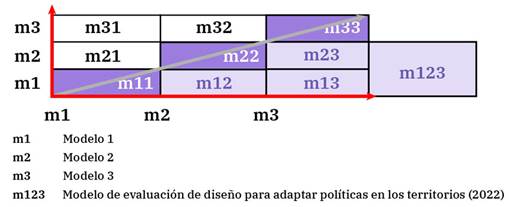 La etapa cuatro se enfoca en la construcción del modelo a través de una matriz triangular, como se detalla en la figura 5. En un plano donde se cruzan los criterios de cada modelo, el elemento m12 de la matriz representa los puntos en común del modelo 1 y 2, el elemento m13 la intersección de los modelos 1 y 3, y así sucesivamente. Por debajo de la línea a 45 grados (flecha celeste) se ubica el resultado de las múltiples comparaciones. De esta manera, el modelo de evaluación de diseño m123 es el propuesto y surge de la amalgama de los tres modelos estudiados como se visualiza en la matriz triangular.
