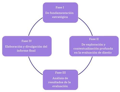 La fase I: de fundamentación estratégica, establece las directrices generales del modelo de evaluación, abordando aspectos cruciales como la planificación, programación y metodología para la evaluación de diseño. Esta fase sienta las bases para el desarrollo efectivo del modelo, con la elaboración de términos de referencia, criterios, preguntas de evaluación, indicadores y fuentes de verificación.