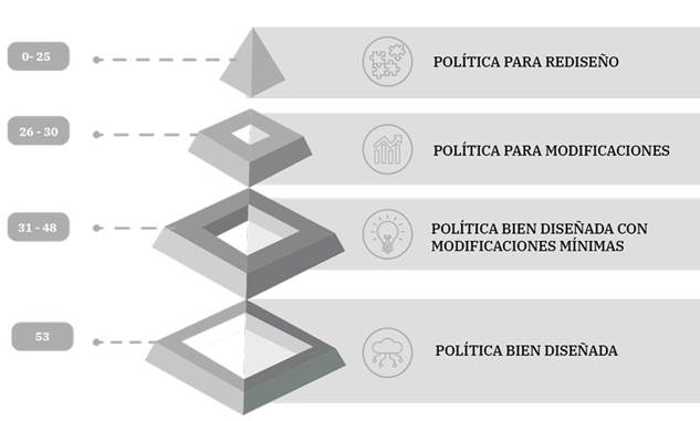 En primer lugar, cuando el número de preguntas con esa puntuación oscile entre 0 y 25, la propuesta a nivel territorial se considera política para rediseño. Esta apreciación indica que la política requiere ser revisada y rediseñada en diversos aspectos para alcanzar su eficacia y propósito, y que no es posible ejecutar recursos para la adaptación de política en el territorio. En segundo término, si el número de las respuestas con la puntuación referencial está en un rango de 26 a 30 ítems se clasifica en la categoría de política para modificaciones. Lo que sugiere que la política posee una base sólida, pero aún necesita ajustes y modificaciones específicas para lograr una implementación exitosa; observaciones que son detalladas por el evaluador en el informe final, para que el formulador pueda hacer los ajustes correspondientes. En tercer lugar, el nivel de política bien diseñada, con modificaciones mínimas se asigna con un rango de 31 a 48 preguntas con la puntuación indicada. Este intervalo refleja que la política ha sido desarrollada con una estructura adecuada, aunque requiere ajustes menores para optimizar su funcionamiento y resultados. Finalmente, se emite el concepto de política bien diseñada cuando se alcanzan 53 preguntas con puntuación de 2. Esta cifra reflejará que la política ha sido concebida de manera efectiva, demostrando coherencia, solidez y una alta probabilidad de lograr sus objetivos sin necesidad de modificaciones significativas. Estos parámetros de evaluación proporcionan una guía clara para determinar la calidad y adecuación de una política en función de su diseño y sus posibles necesidades de ajustes.