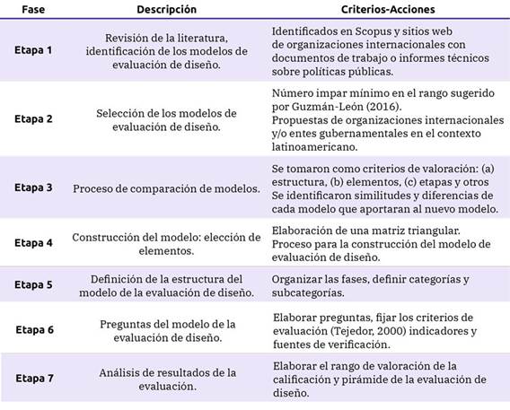 El proceso de la investigación consta de siete etapas, como se detalla en la tabla 3. Las dos primeras etapas corresponden a la revisión y selección de las evaluaciones de diseño que incluyen informes y ponencias sobre evaluación en la gestión pública de organizaciones internacionales y/ o entes gubernamentales. La etapa tres, se centra en la comparación de modelos, considerando la forma de valoración de las cualidades del diseño de la evaluación.